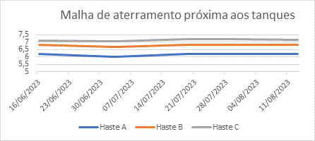 Ademais, no presente estudo, os dados foram coletados a partir das medições da malha de aterramento da indústria química que foram analisados com base em uma comparação da resistência de aterramento em função do tempo, comparando a velocidade da oxidação de duas áreas distintas de tal indústria, tendo uma haste de referência para cada tanque e uma haste de teste, objetivando, assim, visualizar o impacto das substâncias químicas na oxidação da malha de aterramento.