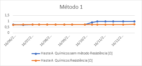 Dessa forma, foi medida cada uma das hastes de aterramento que tinham caixa de inspeção na empresa. Pretendendo verificar a resistência de aterramento, foram coletadas medições a cada 15 dias por um período de 6 meses. Tais valores foram expostos em um gráfico de ohms por tempo, tencionando obter uma comparação entre as duas diferentes áreas da empresa, podendo, assim, visualizar as hastes mais oxidadas. A partir de tal resultado, será realizado o ensaio de quatro métodos para solucionar a oxidação acelerada da malha de aterramento: