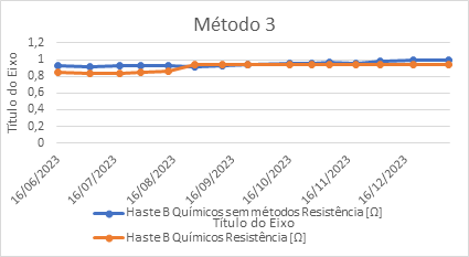 Faz-se importante realçar, como é possível observar na Tabela 6 e nas Figuras 25 e 26, que foram realizadas oito medições da proposição do método 4 – do dia 16 de Outubro de 2023 a 08 de Janeiro de 2024 –, visto que tal método foi acrescentado como uma possível solução para a oxidação acelerada da malha de aterramento em contato com produtos químicos a partir da proposição da Banca de Qualificação do presente estudo.